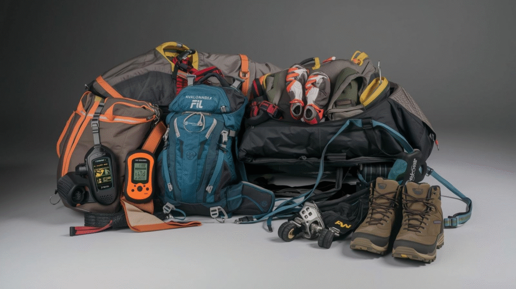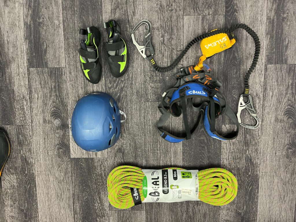Baudriers, casques, mousquetons, dégaines, chaussons d’escalade, cordes, kits de via ferrata, magnésie.